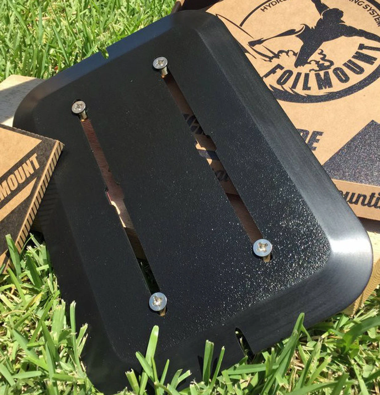 The FoilMount is a universal hydrofoil mounting system, this means that you can put a hydrofoil track on just about any board you already have.  The FoilMount uses a specially designed 3M adhesive tape to stick to the bottom of your board. It will accommodate any foil that uses the 90mm track system (this is industry standard). It is a easy way to fix a broken track system. It is also great for retrofitting boards with through bolt holes to give them the adjust-ability of a sliding track system.Â