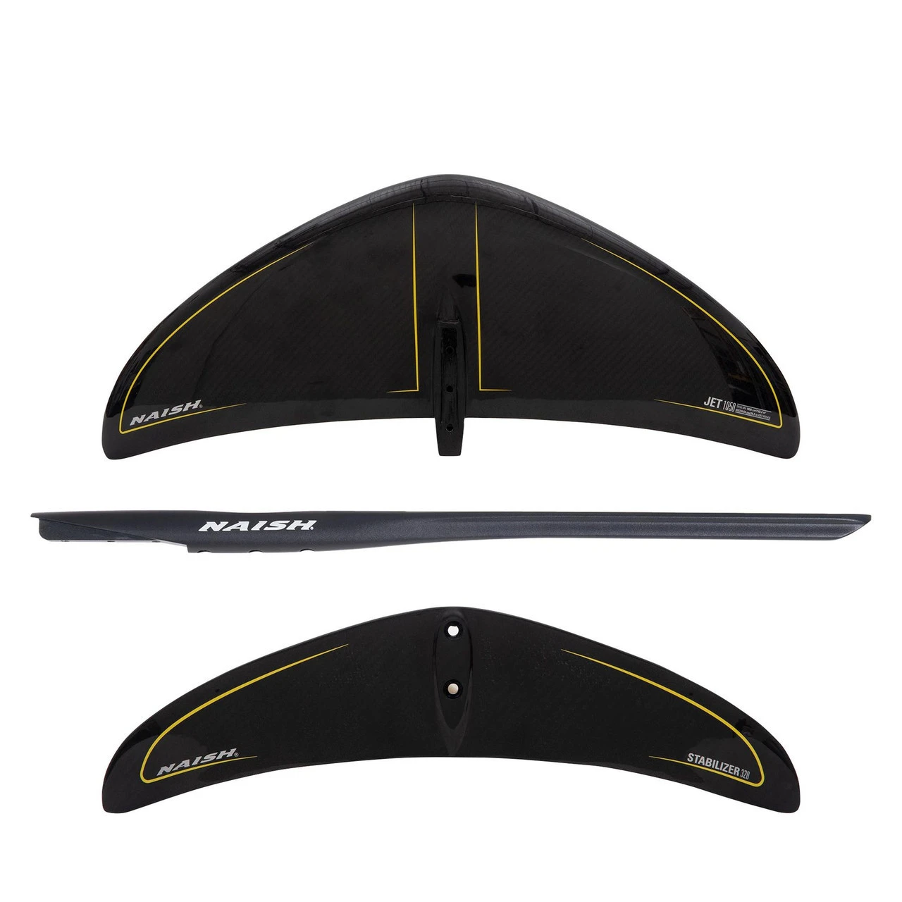 Naish Jet foils feature a medium aspect ratio delta-wing planform with moderate anhedral to deliver the optimum combination of early lift, speed, and turning ability. These wings are the ideal choice for foil surfing as well as a wide range of disciplines from windsurfing and wing-surfing to downwind kite foiling. The 1050 and 1250 are the go-to sizes for surf foiling in faster, steeper surf. These wings are also an excellent option for light wind kite foiling and windsurf foiling on crossover style boards. These wings are paired with the Stabilizer 320 back wing, which gives the complete setup more intuitive turning and response for pumping.