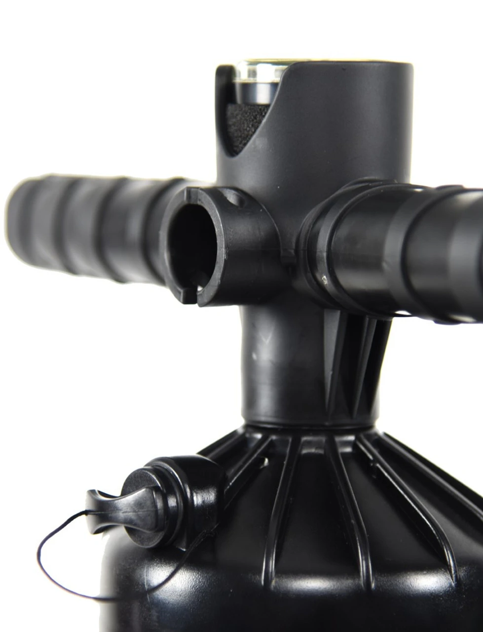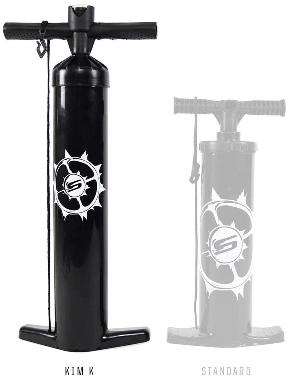 Newly engineered seals and pistons combined with newly molded handle and feet offer improved ergonomics and inflation speed. Single- to double-stroke inflation switch allows for instant change from high-volume /low-pressure inflation to low-volume / high-pressure. Comes standard with kite tether and hook, kite-tuned Slingshot pressure gauge, integrated sand filter, premium high-flow and extra-durable hose, and the two extra kite nozzles to fit most most kites on the market – make this the finest standard-height pump ever produced. Not recommended for inflation higher than 13 PSI.